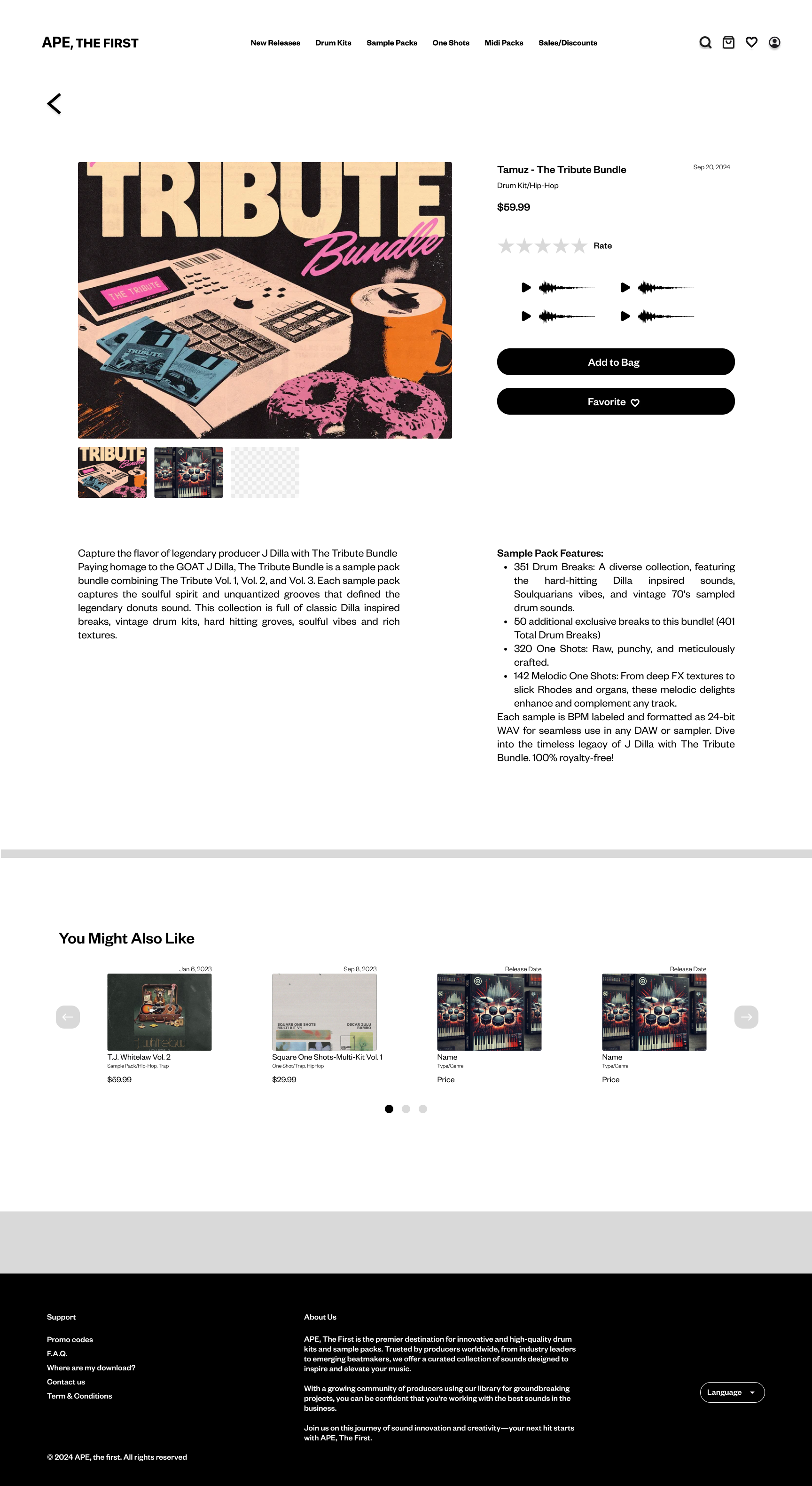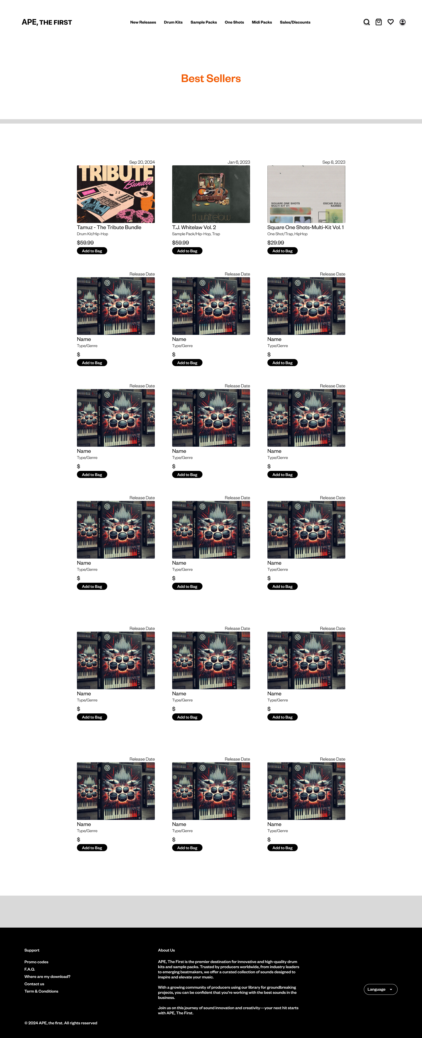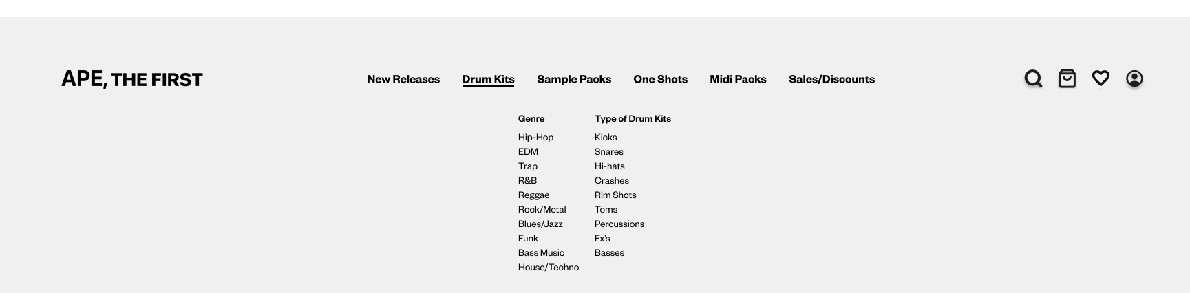 I created APE, the first, a fictional sound/drum kit website for music producers. The goal was to design a clean website where users could easily explore and purchase drum kits.