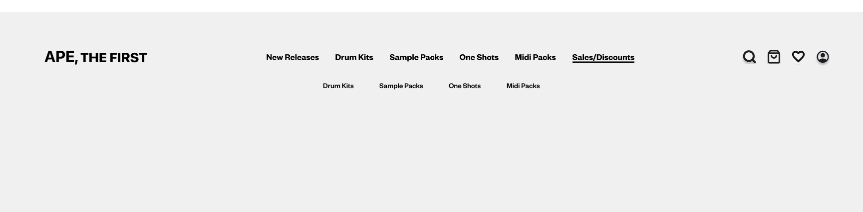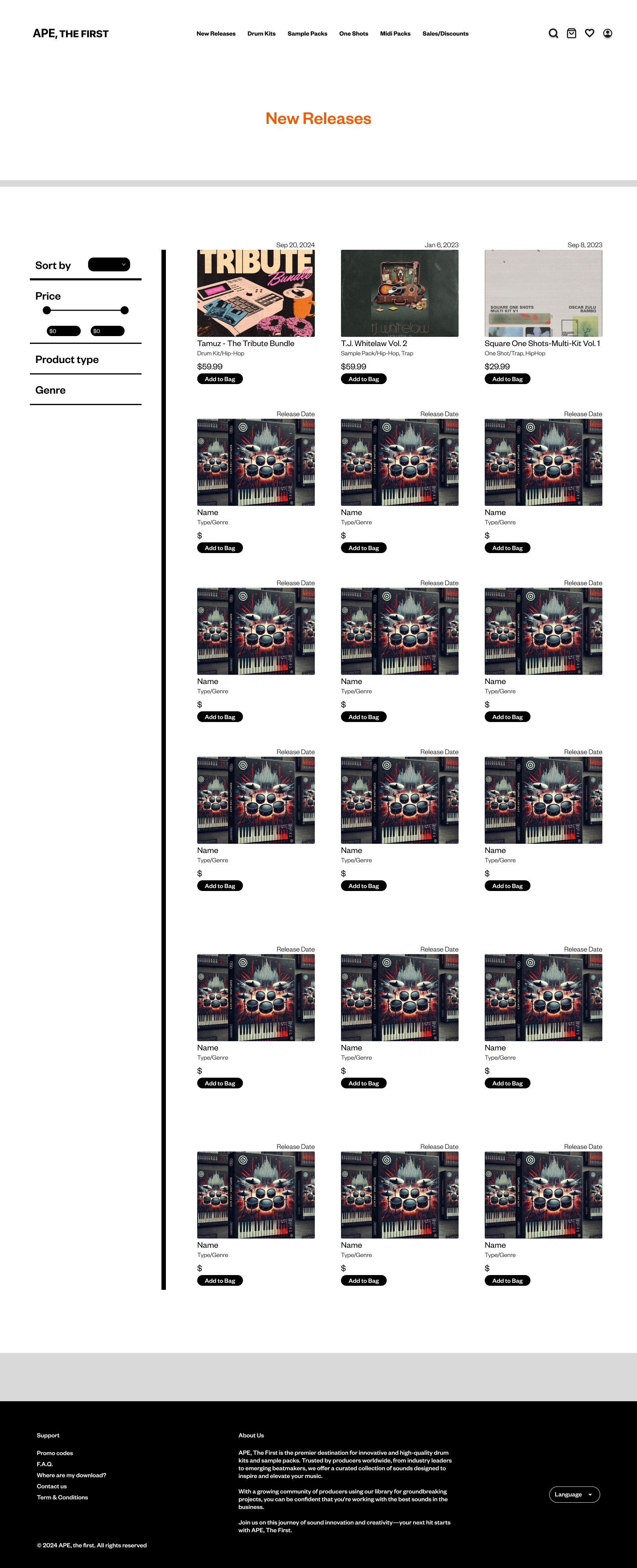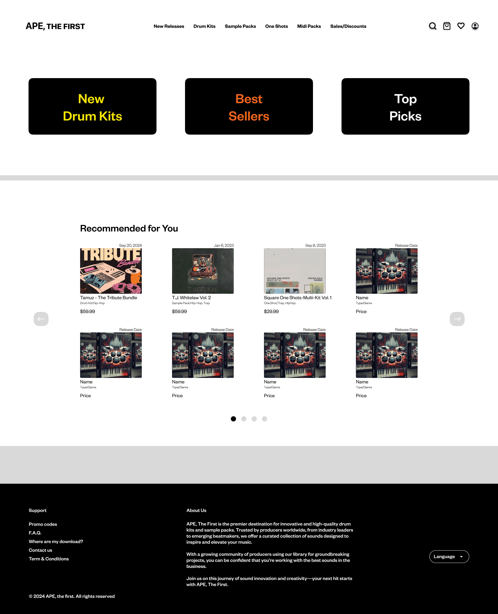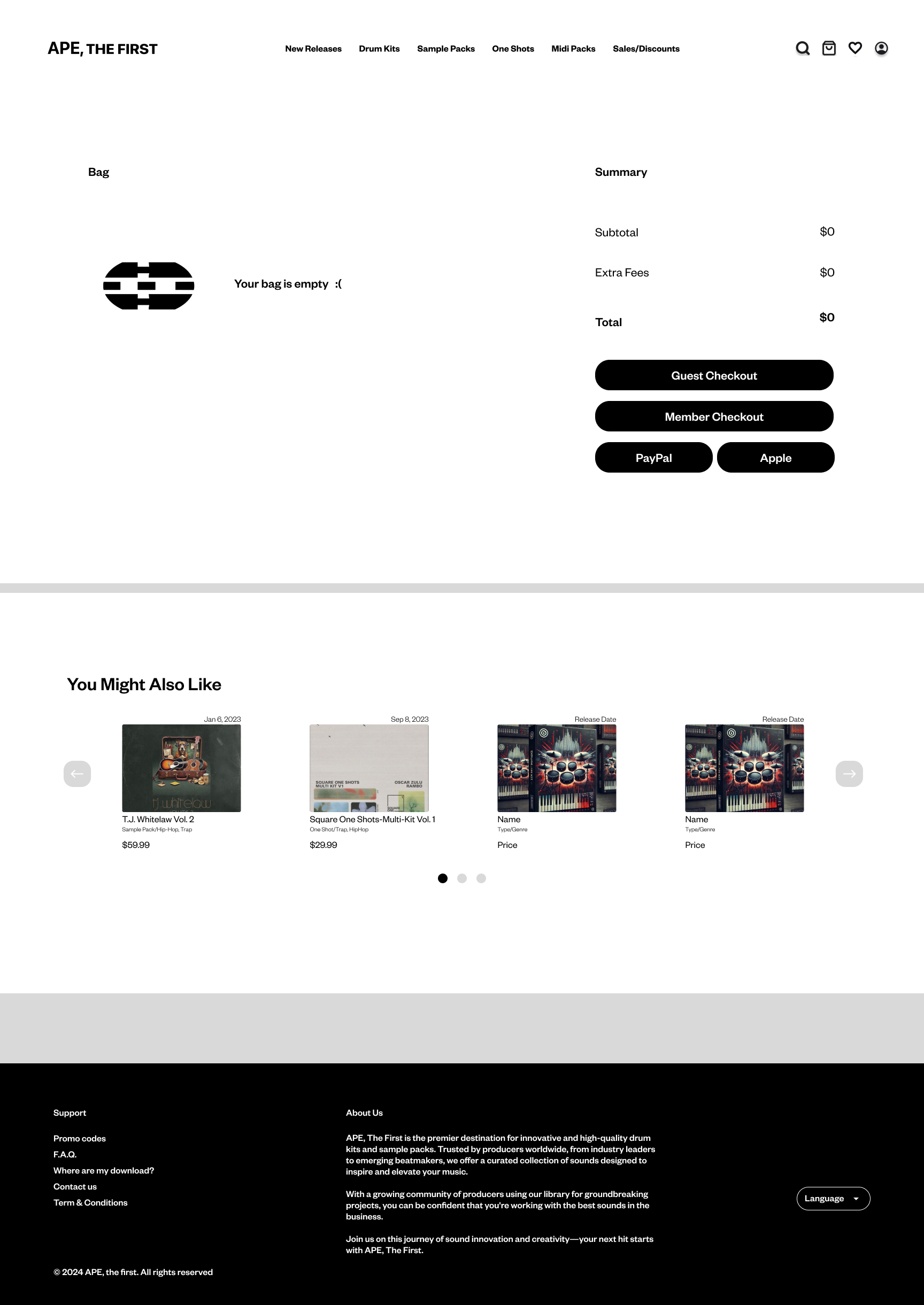 I created APE, the first, a fictional sound/drum kit website for music producers. The goal was to design a clean website where users could easily explore and purchase drum kits.