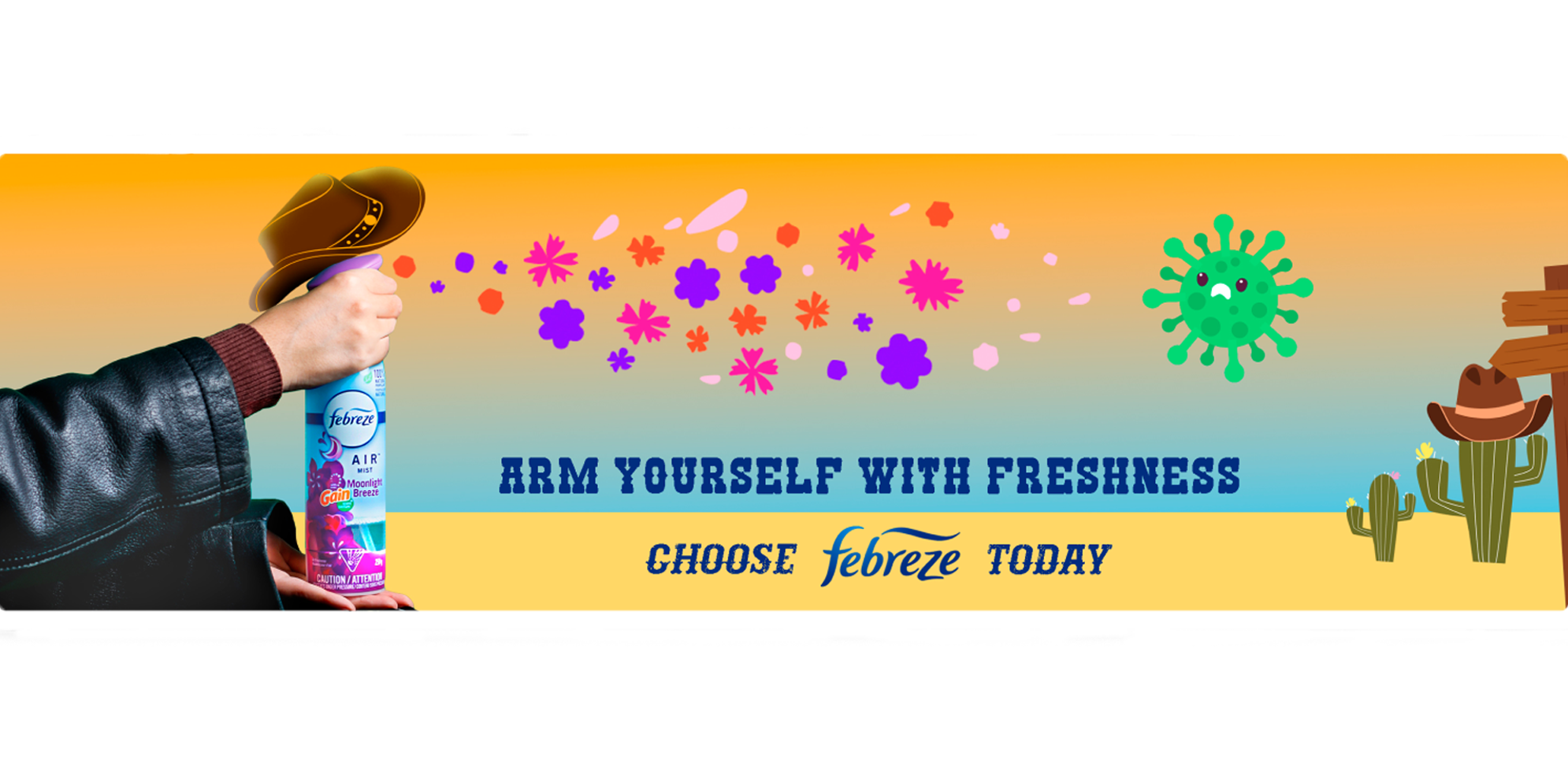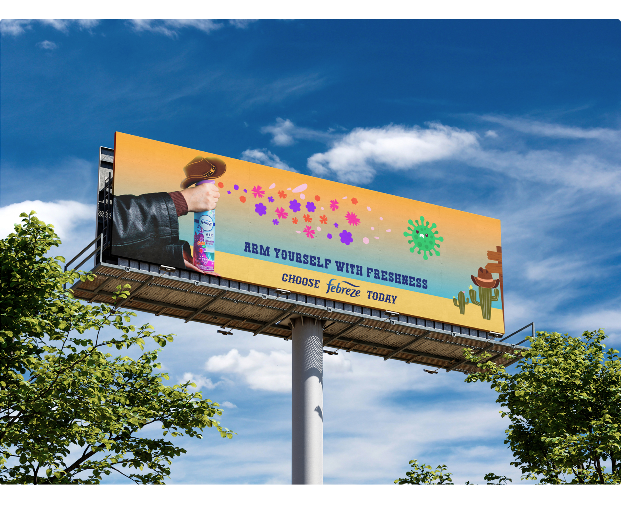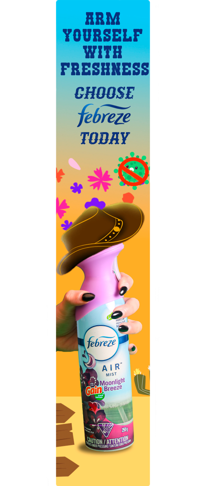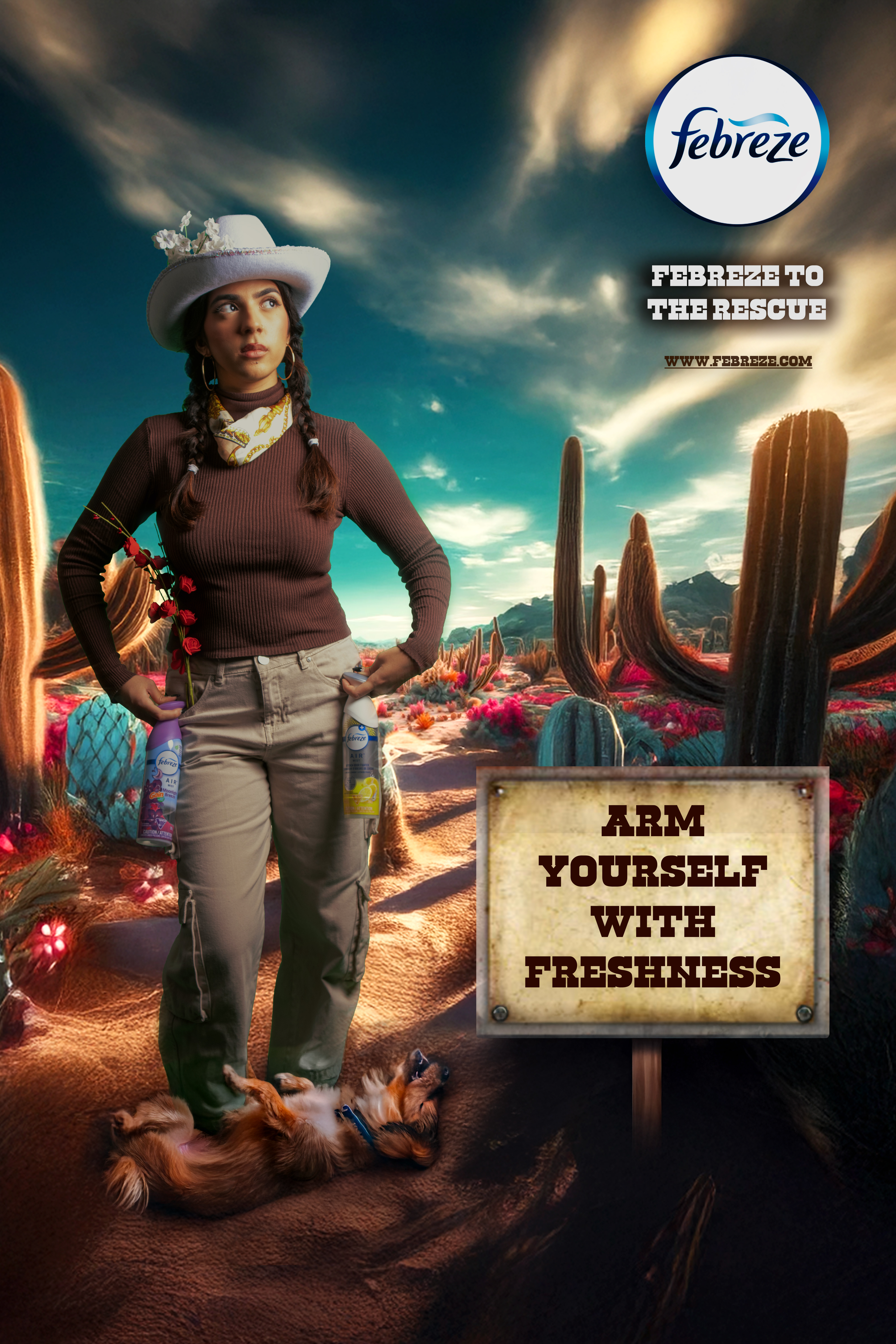 This was a college group project where we created an ad campaign for Febreze Air Freshener. Our goal was simple, show that Febreze doesn’t just mask bad odors, it gets rid of them. To bring this idea to life, we went with a Western-inspired concept, featuring a cowgirl who treats Febreze like her weapon of choice to "clear the air."