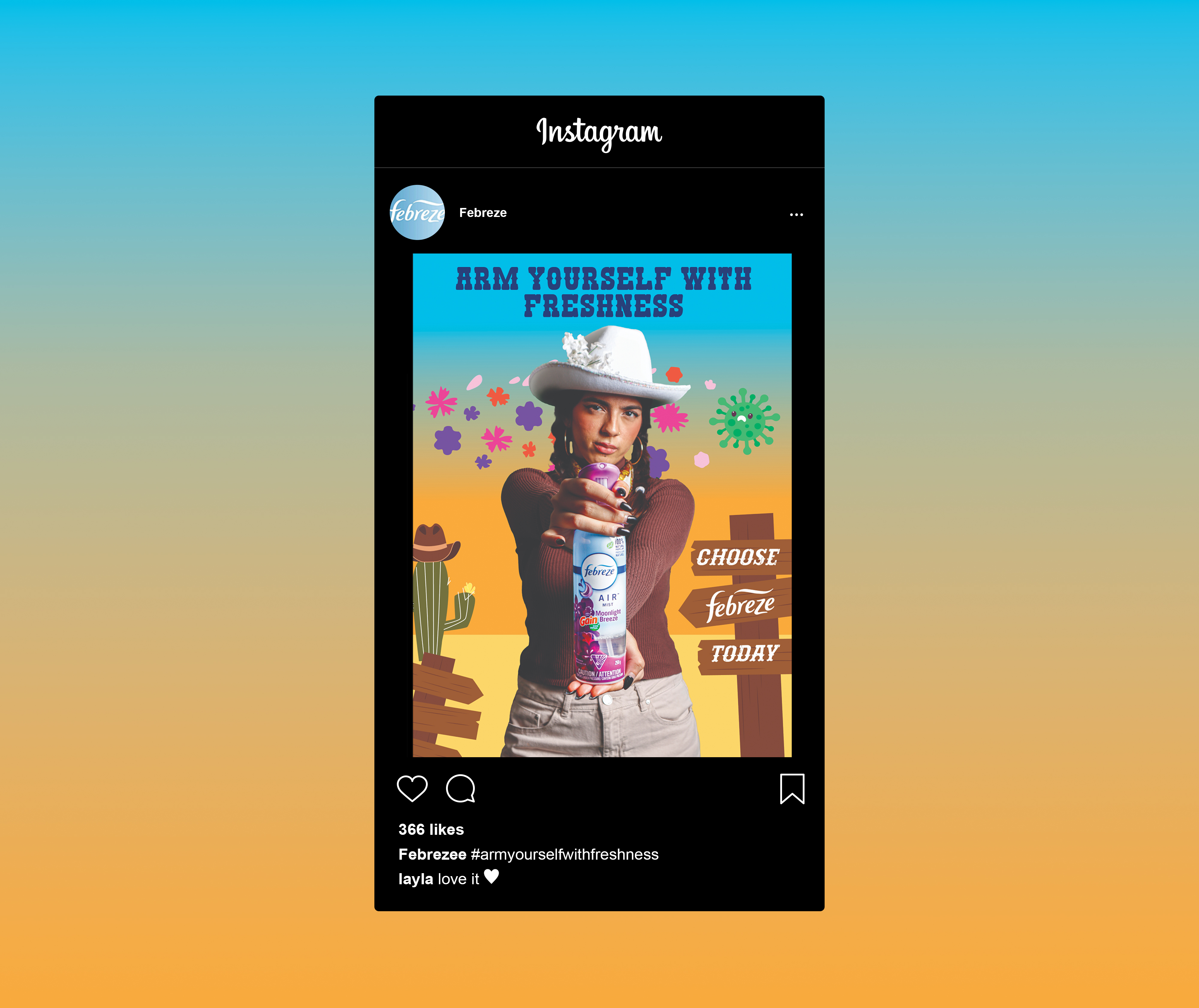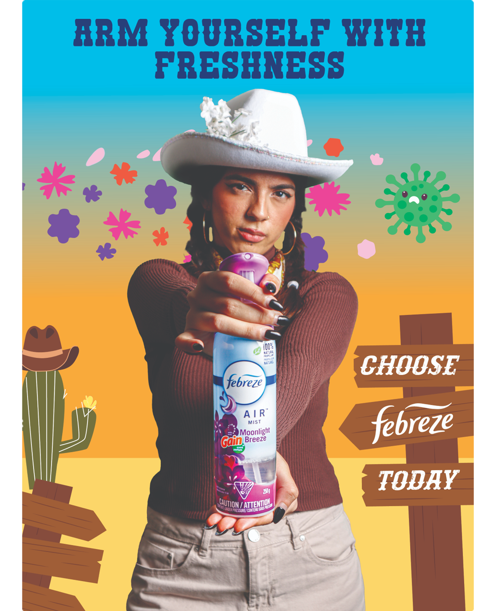 We worked with photographers to create original visuals instead of using stock images. The photoshoot had a clean, minimal setup, keeping the focus on the cowgirl and Febreze. She struck strong, confident poses, reinforcing the idea that Febreze is powerful and reliable. This project was a great mix of teamwork, creativity, and hands on experience in building a campaign from scratch.