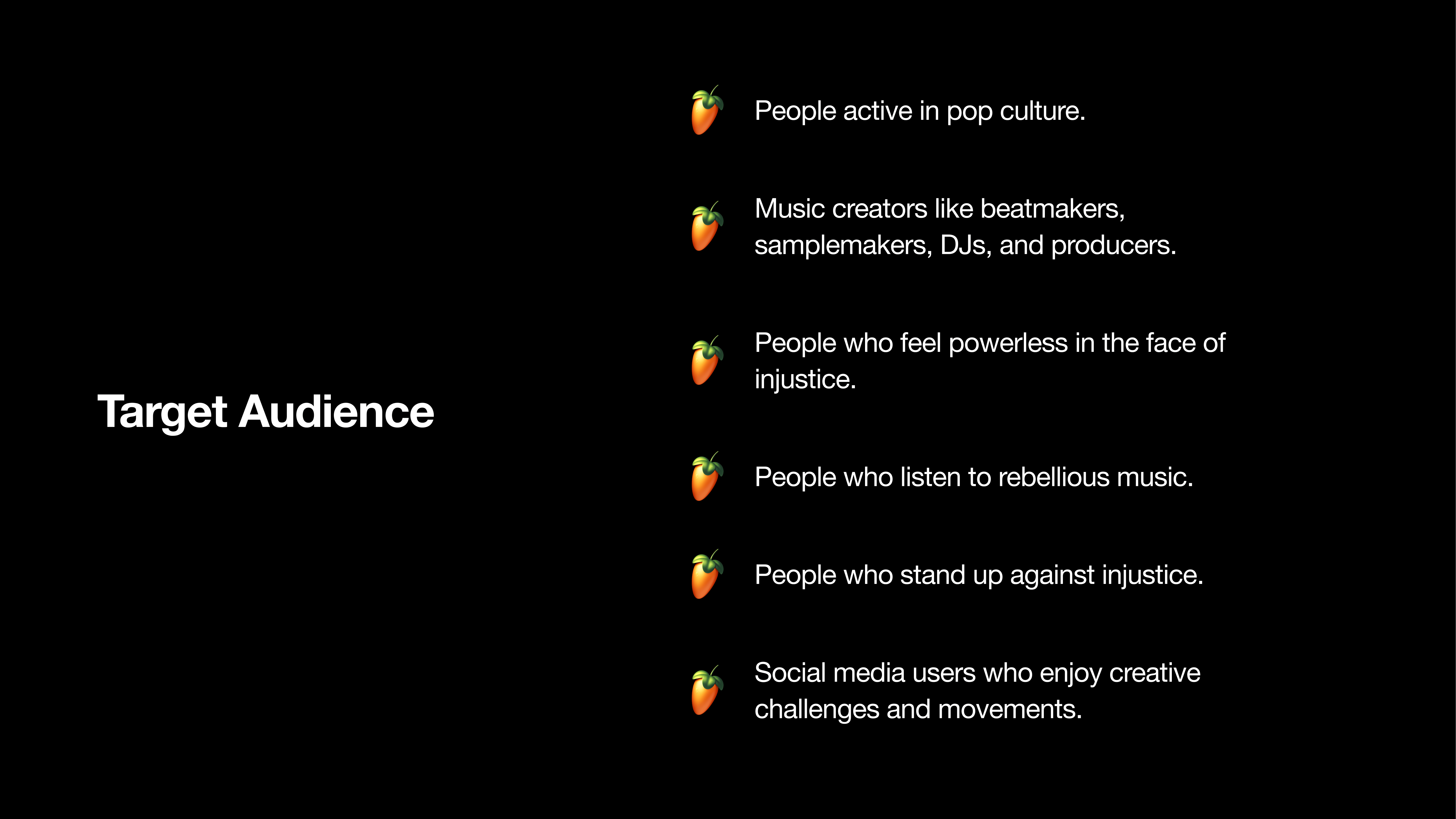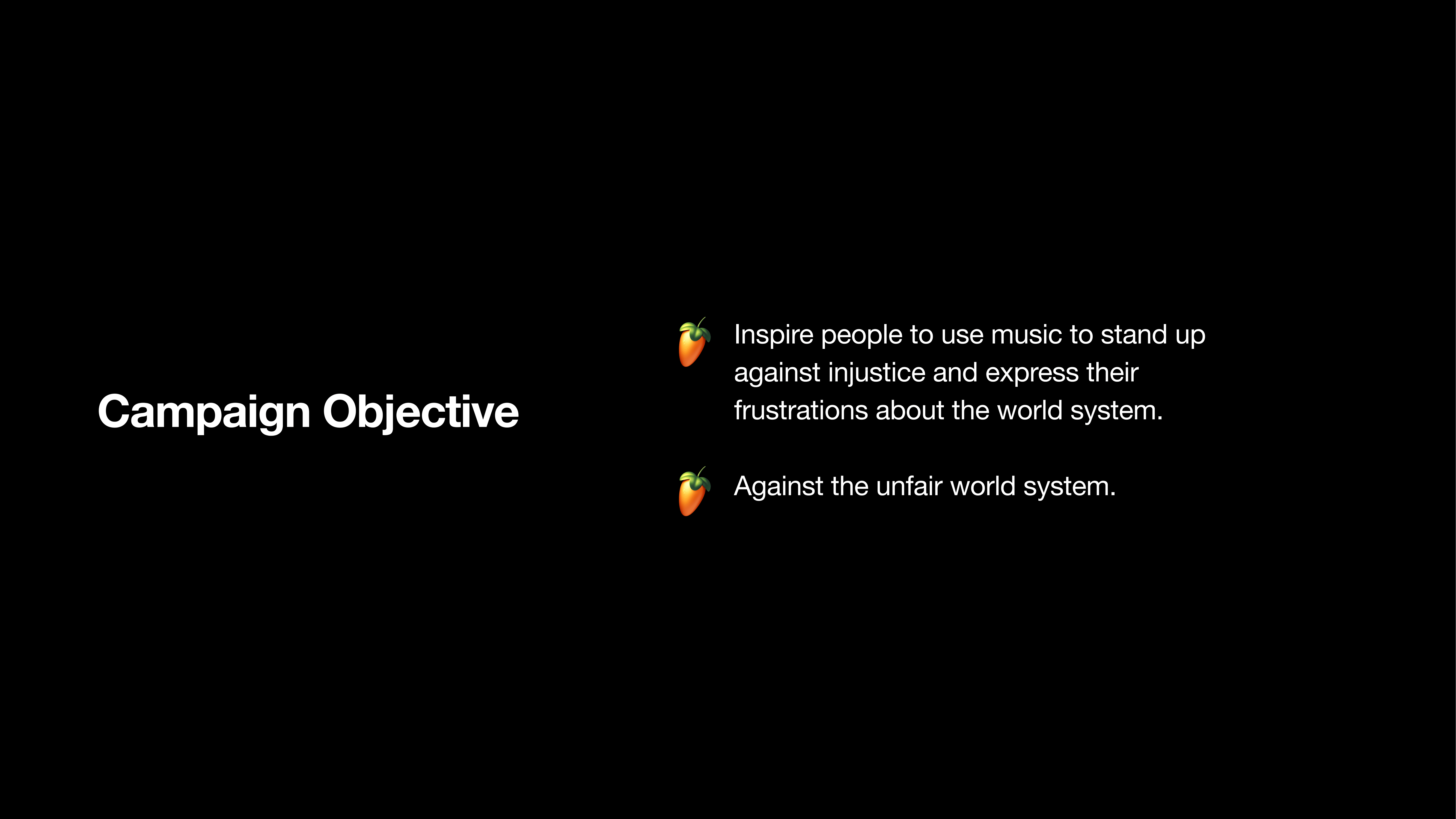 The campaign tagline, "The Revolution Will Not Be Televised", encourages musicians to make noise against injustice. It includes sound pack inspired by feeling of rebellion, merchandise, and free FL Studio licenses to underprivileged artists.