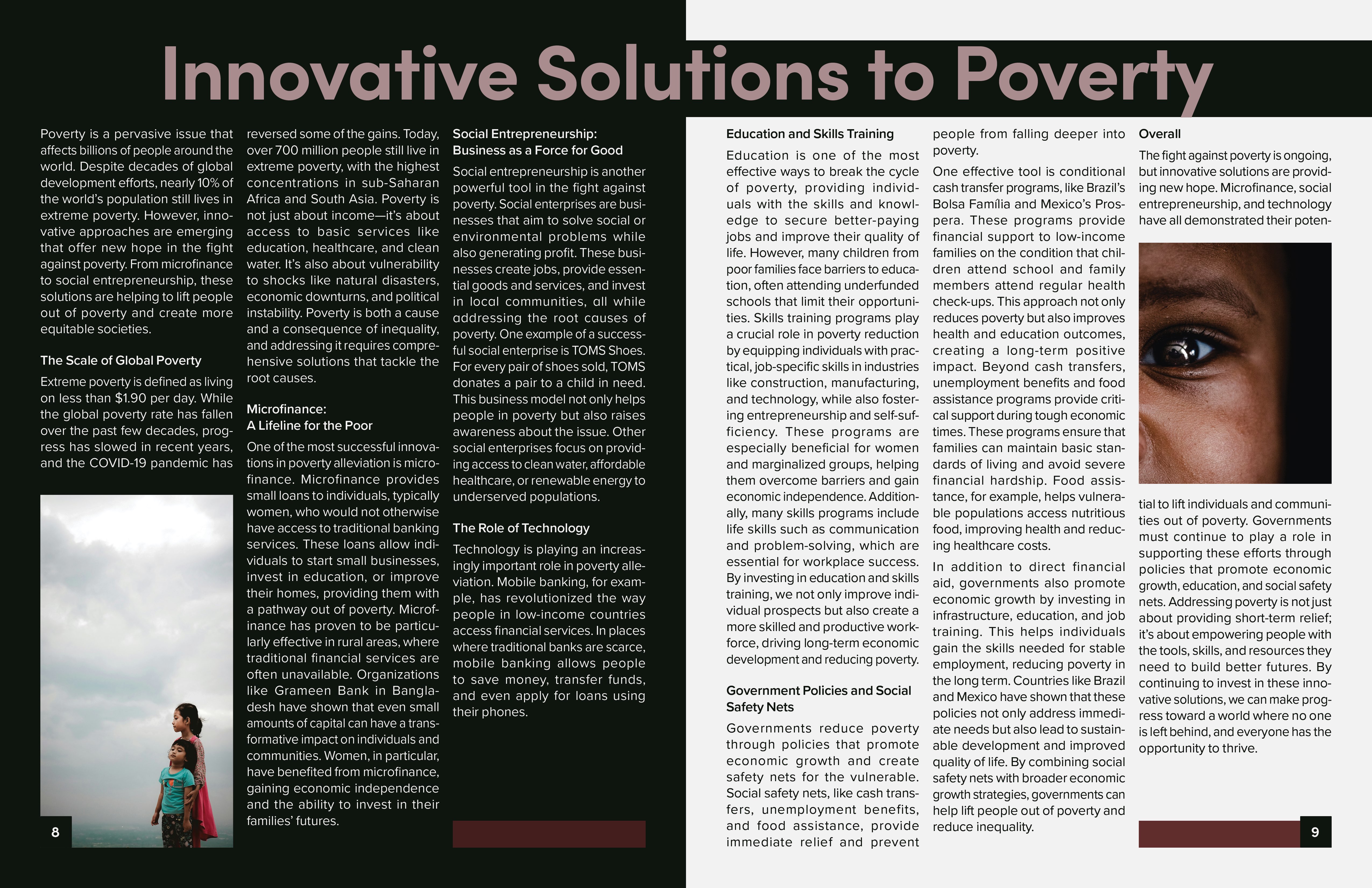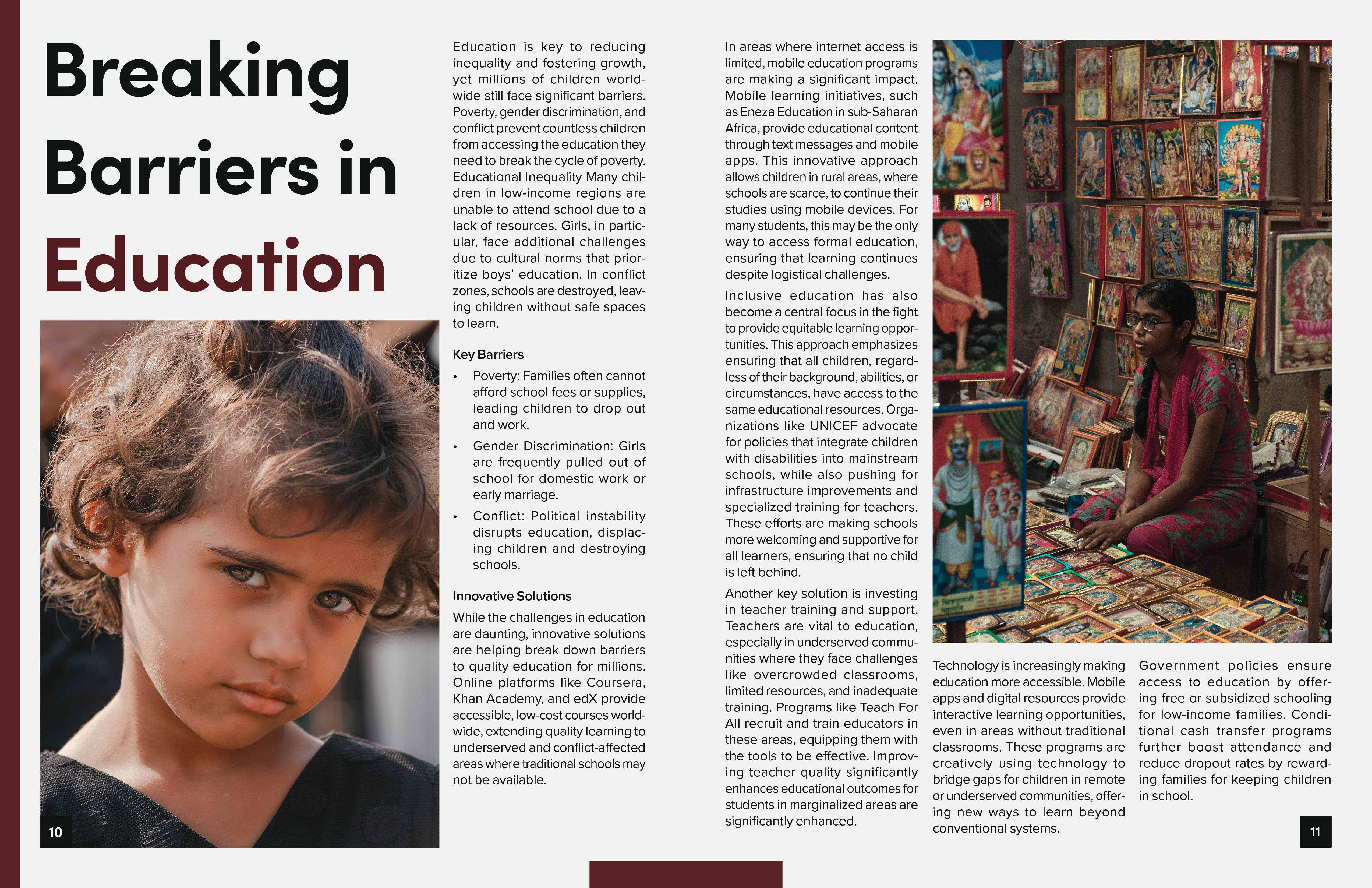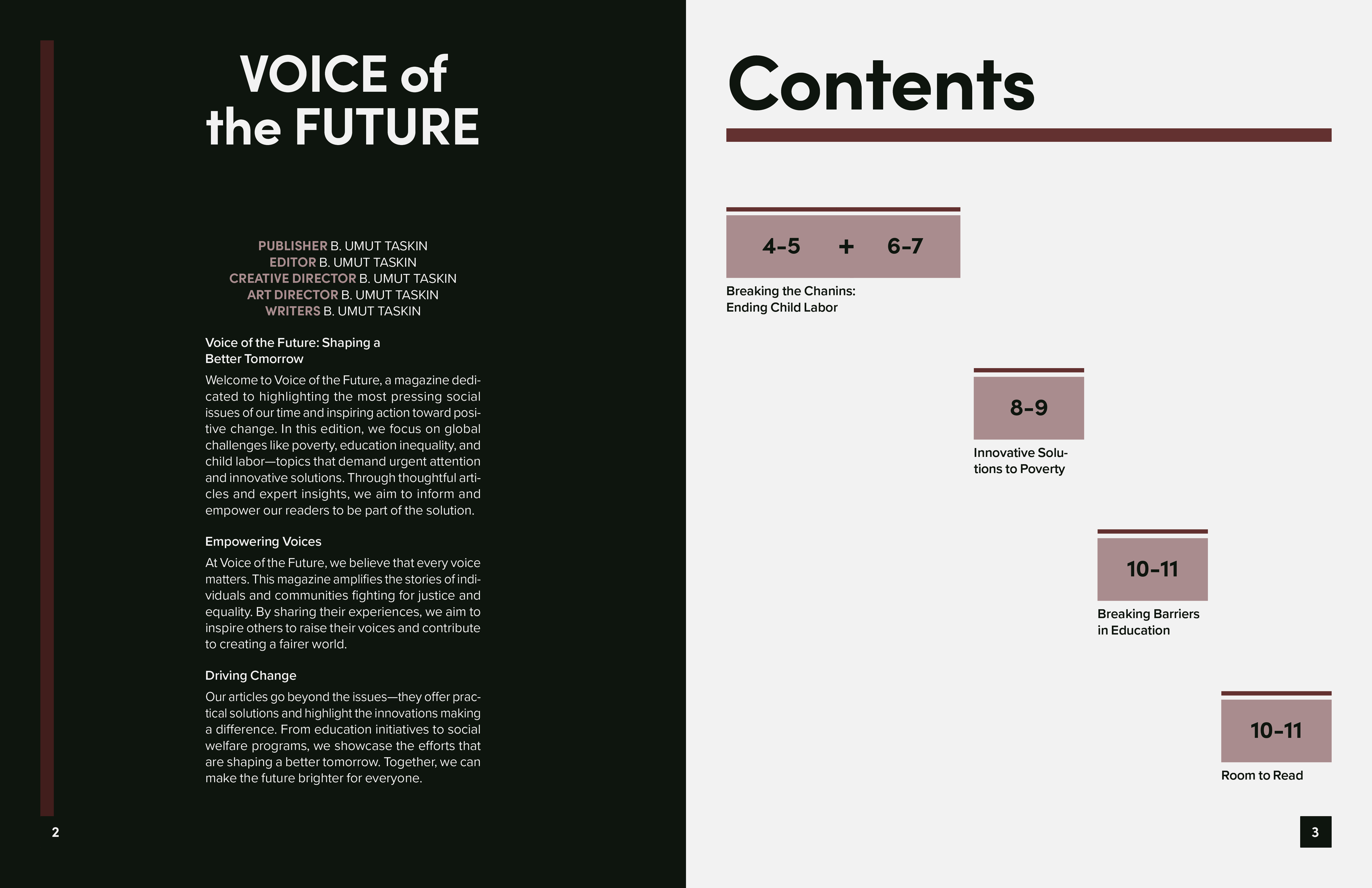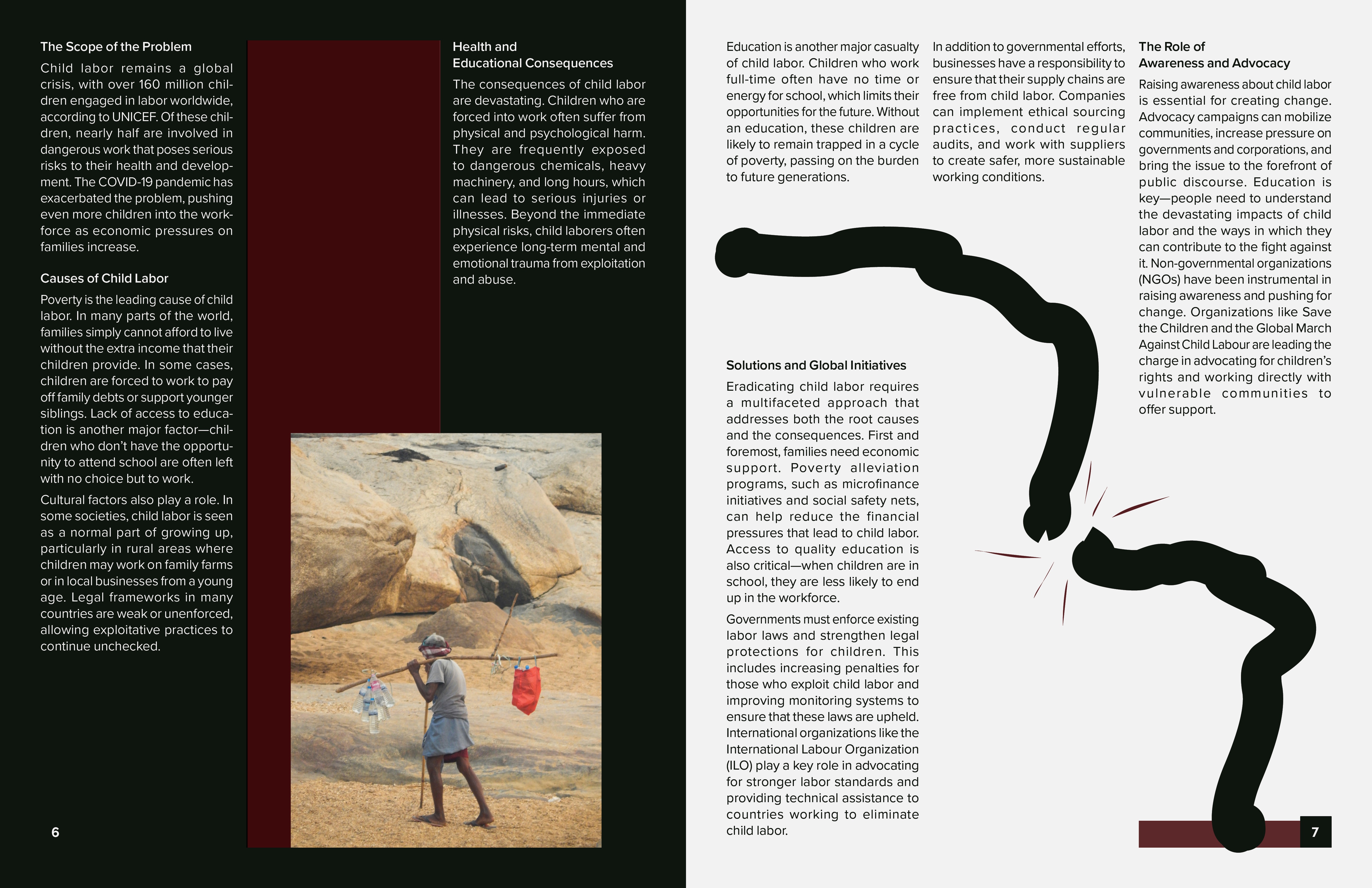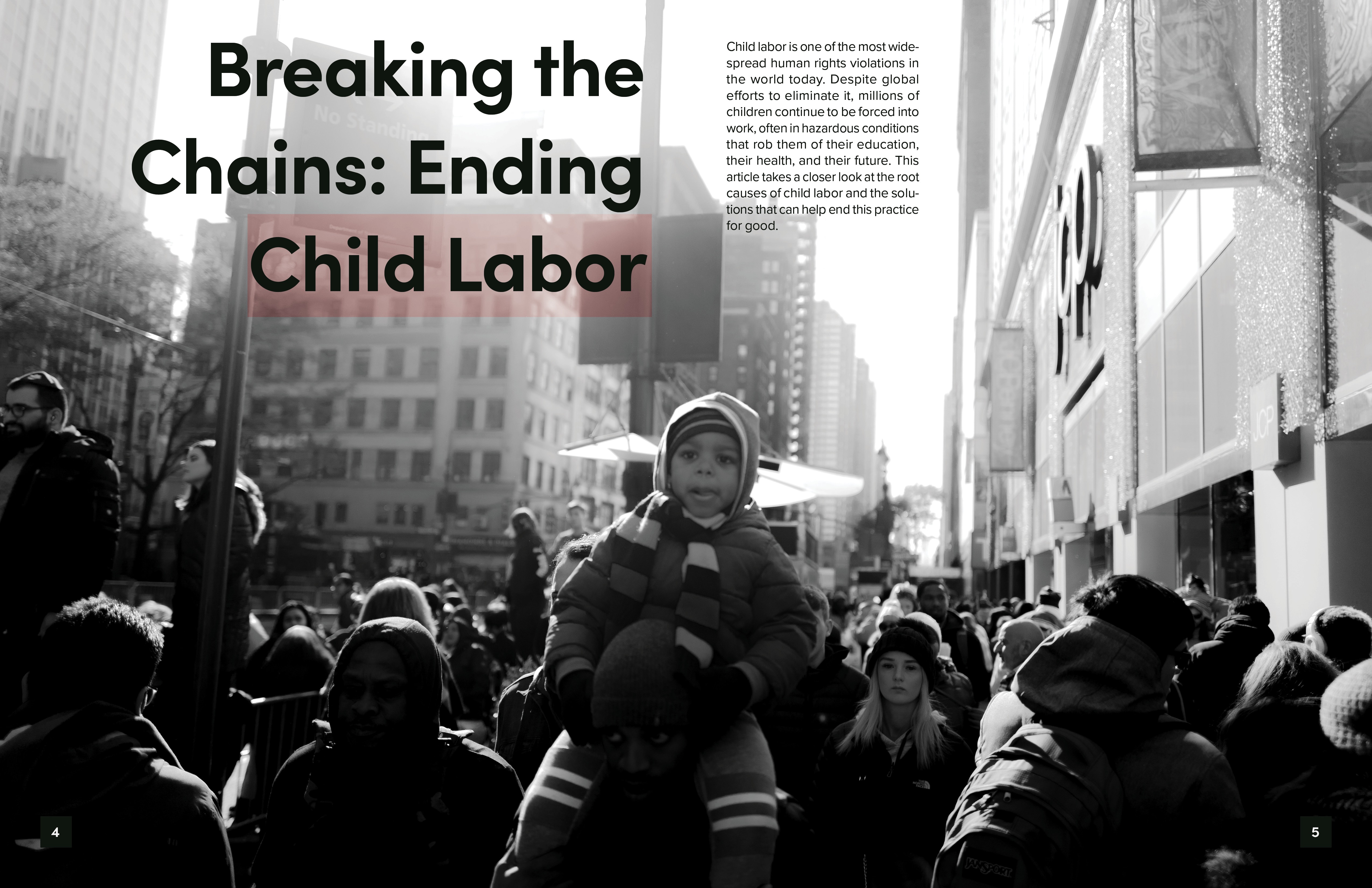 I chose to address global issues such as child labor, poverty, and education. My goal was to balance impactful storytelling with clean, minimalistic layouts, emphasizing readability and strong visual hierarchy.